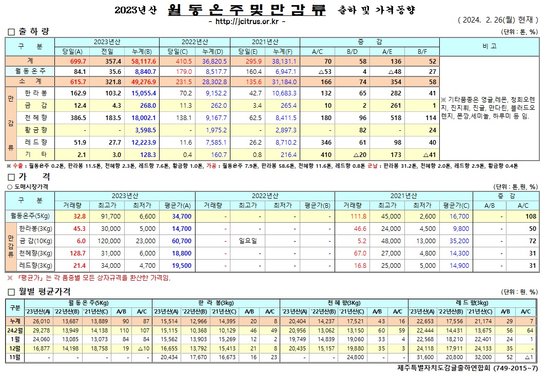 [월동&만감]2023년산 출하 및 가격동향(2/26)