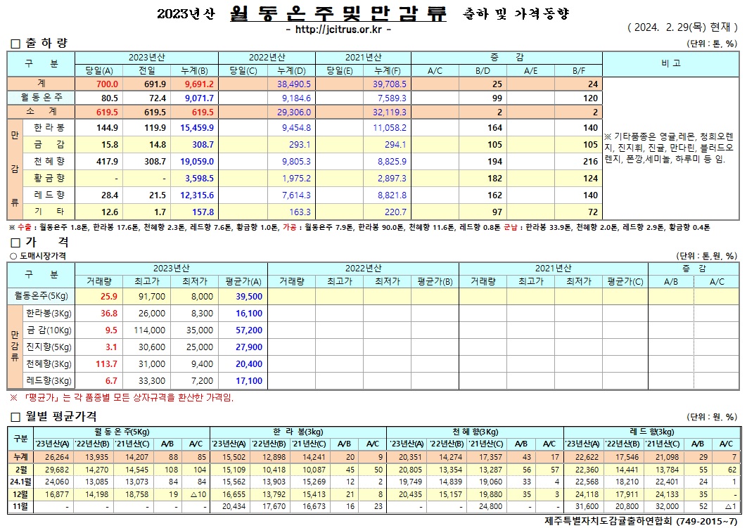 [월동&만감]2023년산 출하 및 가격동향(2/29)