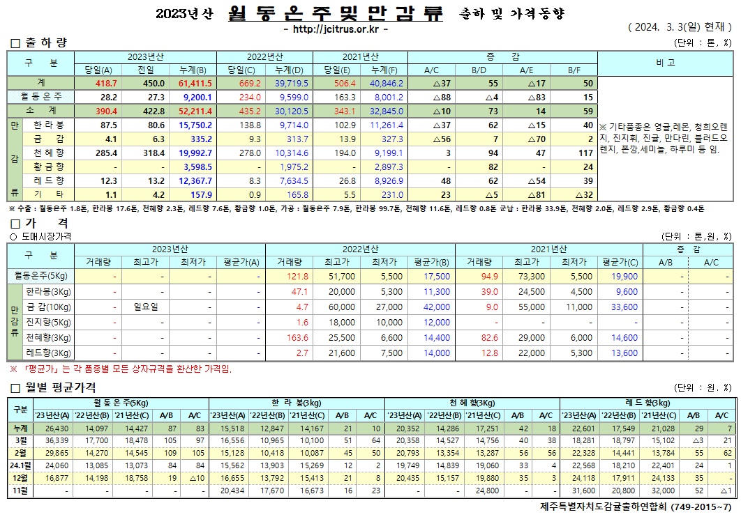 [월동&만감]2023년산 출하 및 가격동향(3/03)
