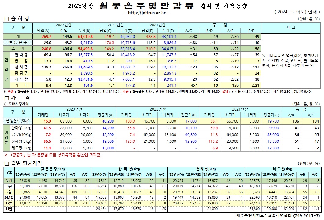 [월동&만감류]2023년산 출하 및 가격동향(3/9)