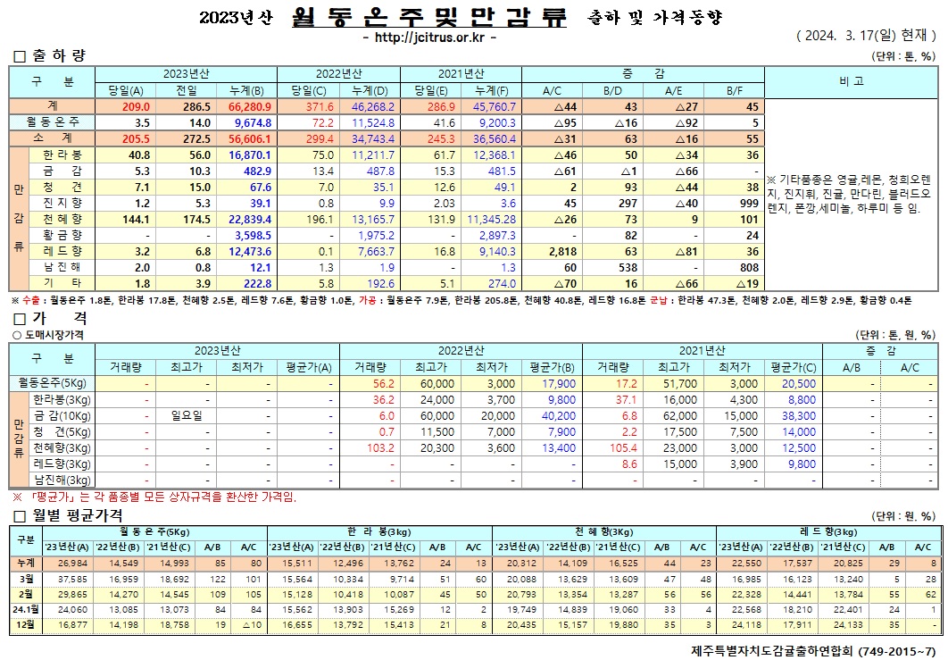 [월동&만감]2023년산 출하 및 가격동향(3/17)