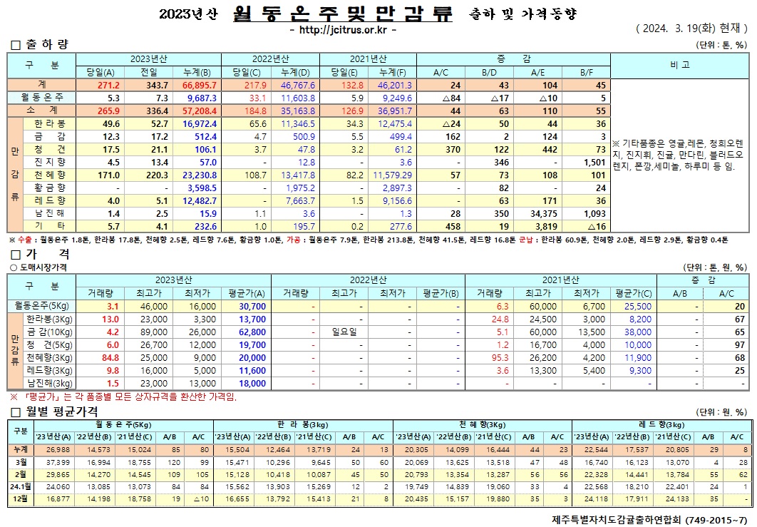 [월동&만감]2023년산 출하 및 가격동향(3/18)
