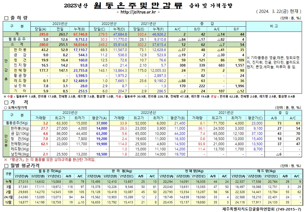 [월동&만감]2023년산 출하 및 가격동향(3/22)