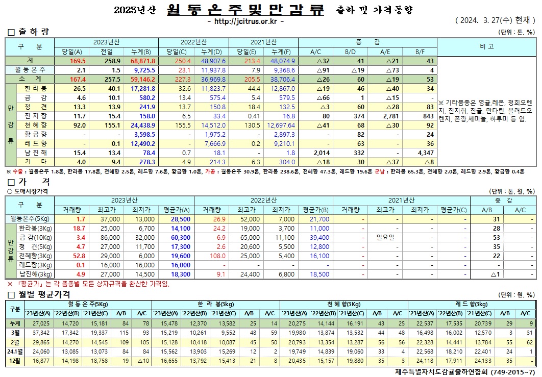 [월동&만감]2023년산 출하 및 가격동향(3/27)