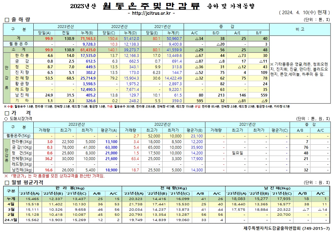 [월동&만감]2023년산 출하 및 가격동향(4/10)