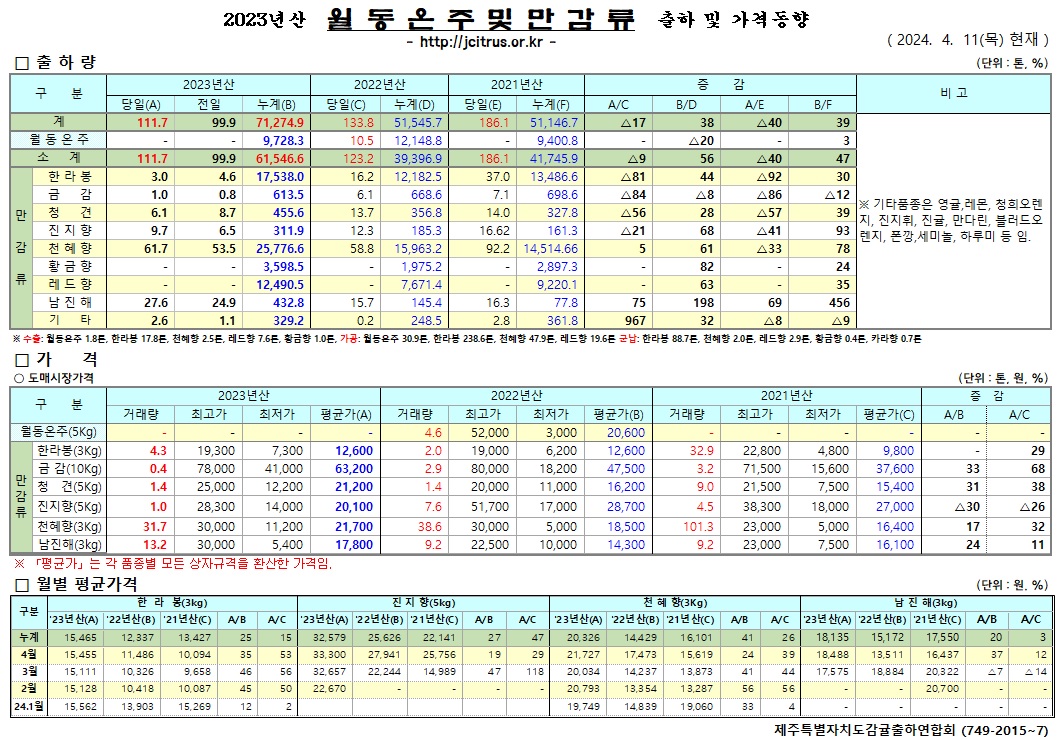 [월동&만감]2023년산 출하 및 가격동향(4/11)