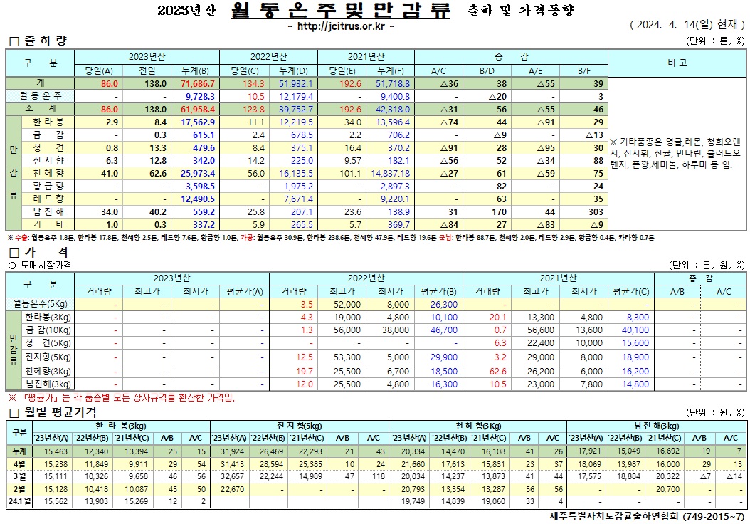 [월동&만감]2023년산 출하 및 가격동향(4/14)