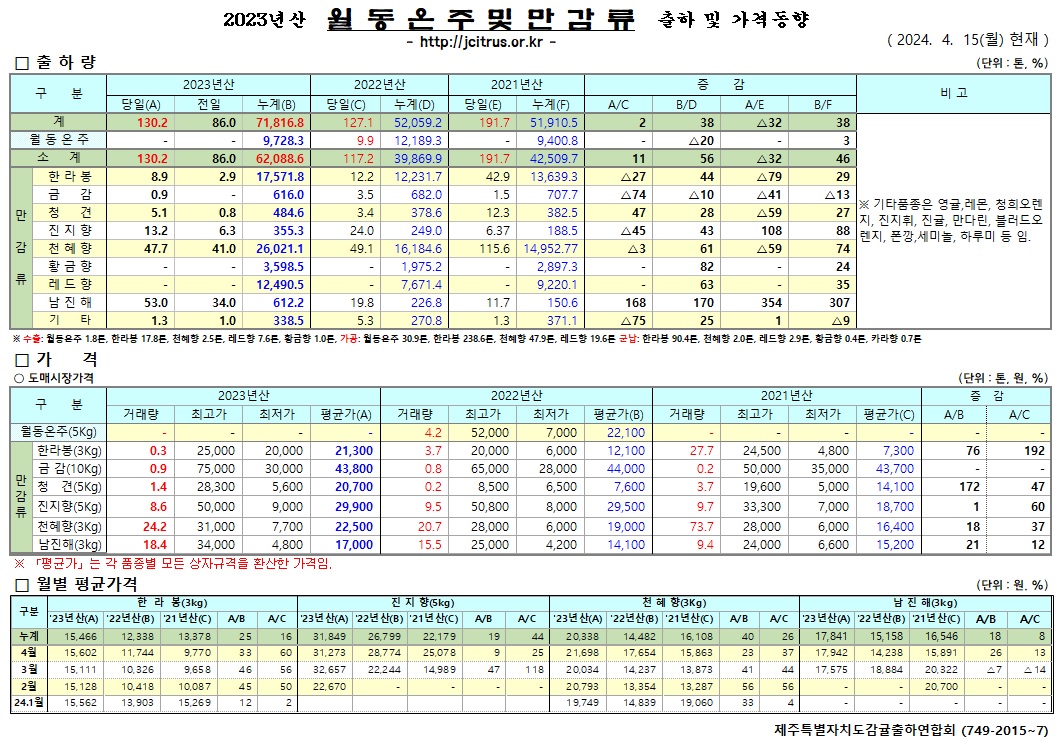 [월동&만감]2023년산 출하 및 가격동향(4/15)