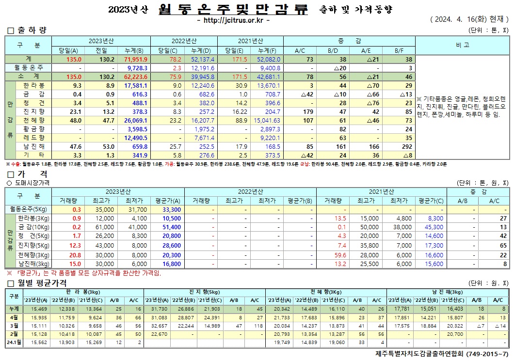 [월동&만감]2023년산 출하 및 가격동향(4/16)