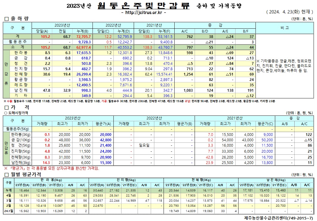 [월동&만감]2023년산 출하 및 가격동향(4/23)