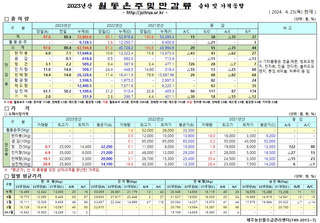 [월동&만감]2023년산 출하 및 가격동향(4/25)