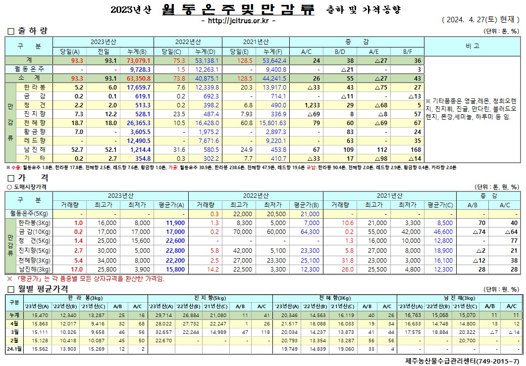 [월동&만감]2023년산 출하 및 가격동향(4/27)