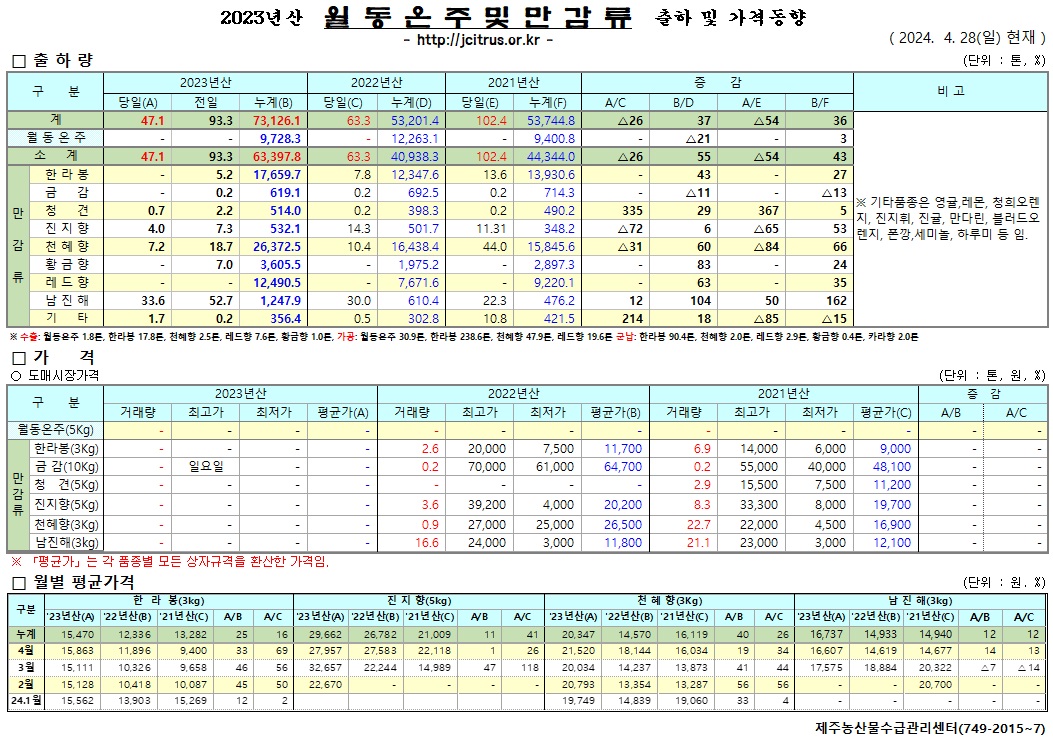 [월동&만감]2023년산 출하 및 가격동향(4/28)
