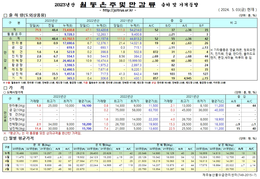 [월동&만감]2023년산 출하 및 가격동향(5/03)