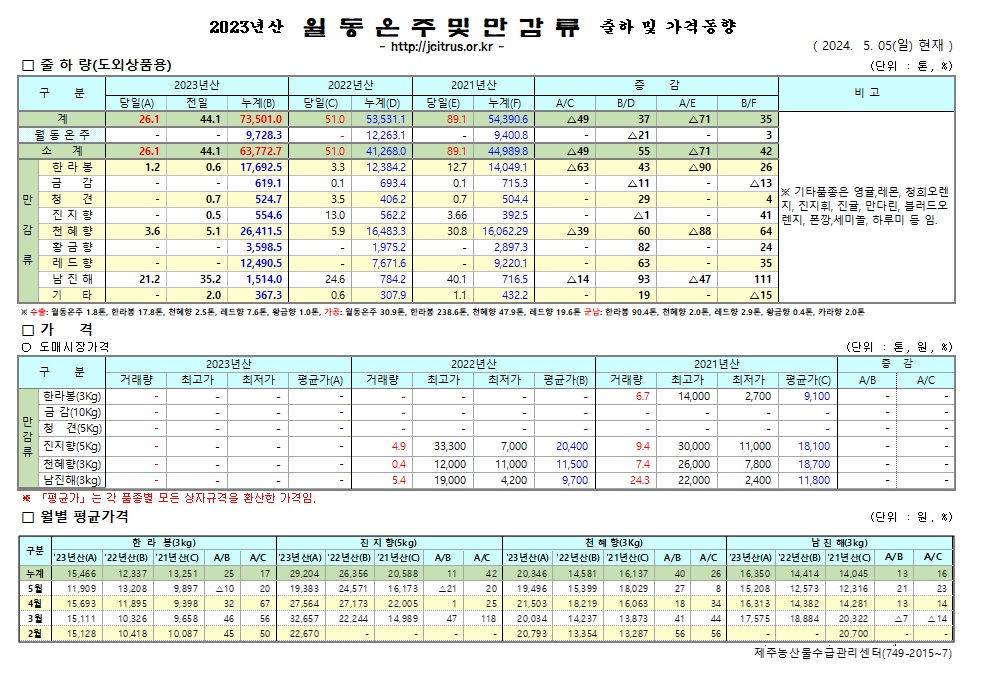 [월동&만감]2023년산 출하 및 가격동향(5/05)
