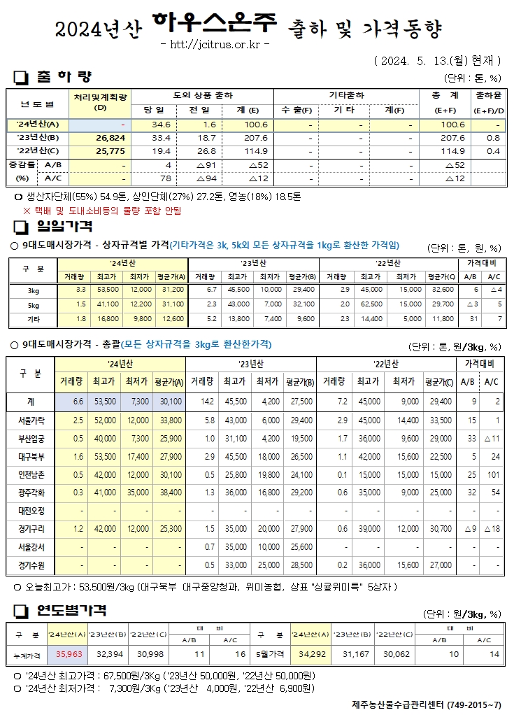 [하우스온주]2025년산 출하 및 가격동향(10/13)