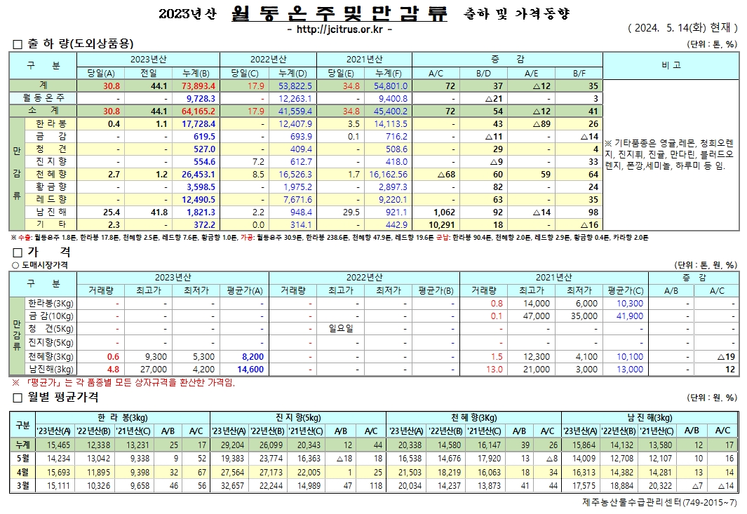 [월동&만감]2023년산 출하 및 가격동향(5/14)