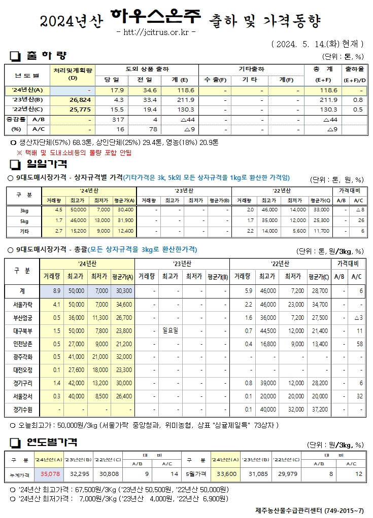 [하우스온주]2024년산 출하 및 가격동향(5/14)