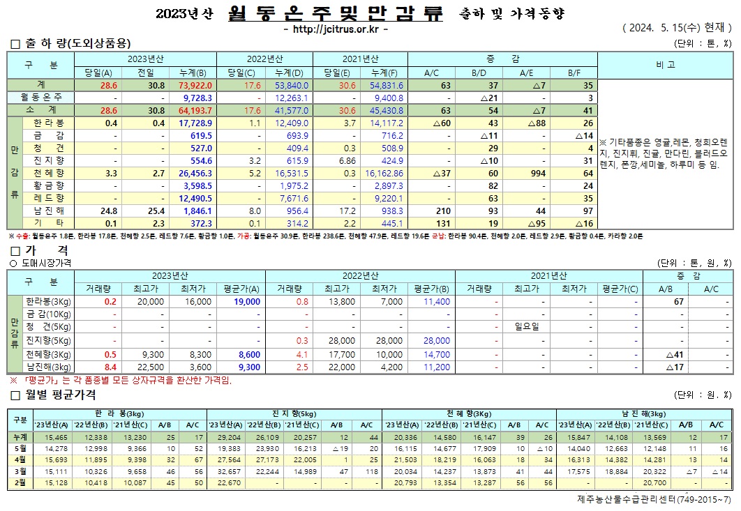 [월동&만감]2023년산 출하 및 가격동향(5/15)