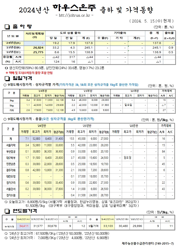 [하우스온주]2024년산 출하 및 가격동향(5/15)