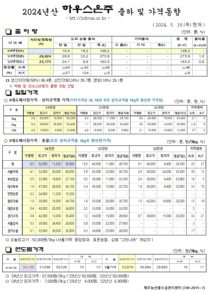 [하우스온주]2024년산 출하 및 가격동향(5/16)