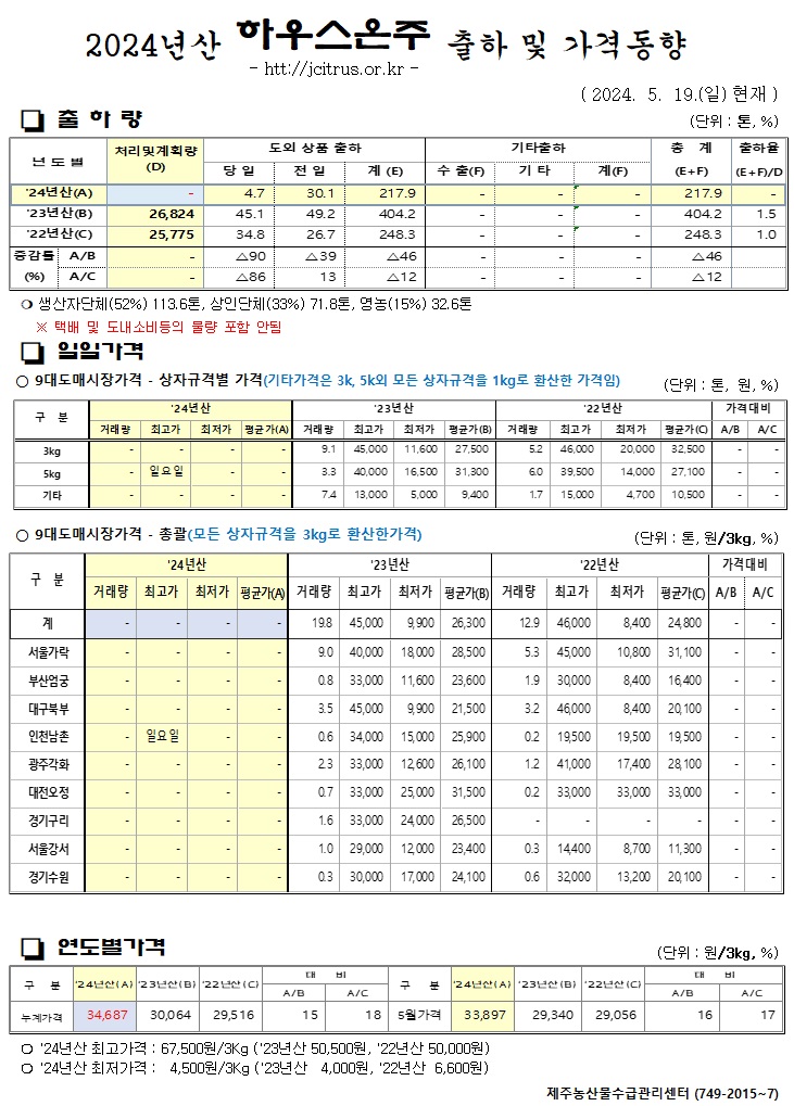[하우스온주]2024년산 출하 및 가격동향(5/19)