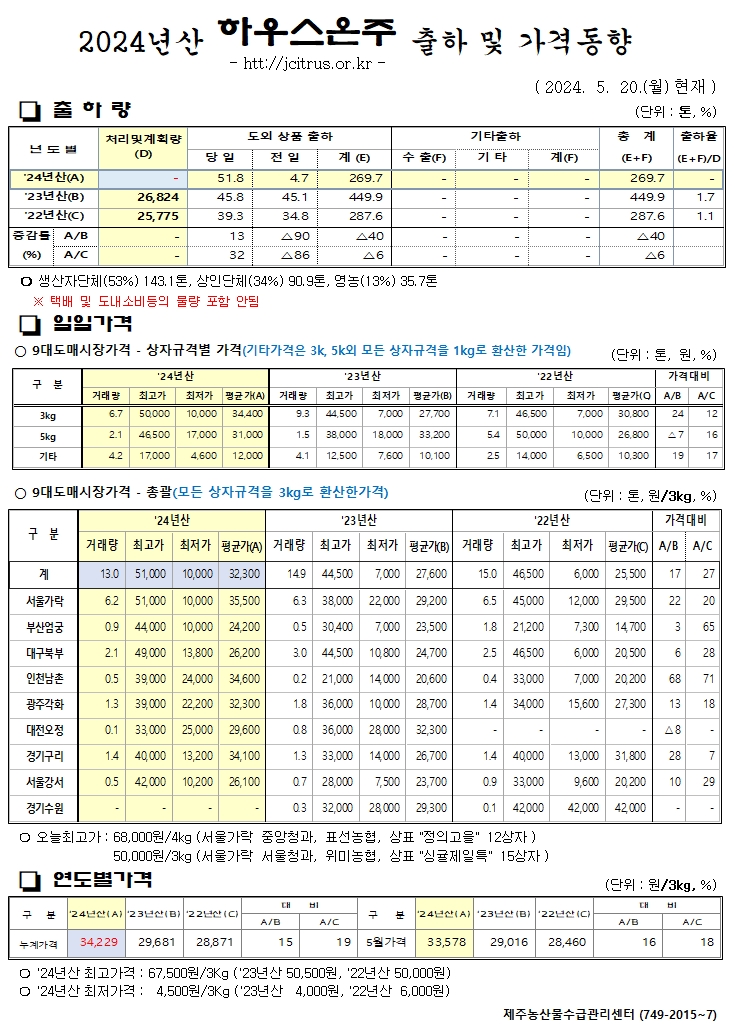 [하우스온주]2024년산 출하 및 가격동향(5/20)