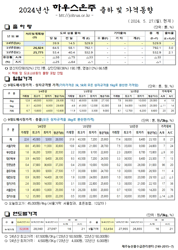 [하우스온주]2024년산 출하 및 가격동향(5/27)