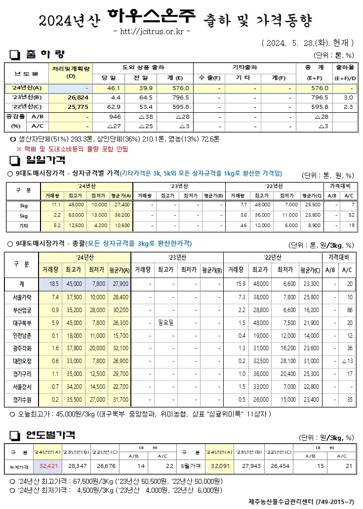 [하우스온주]2024년산 출하 및 가격동향(5/28)