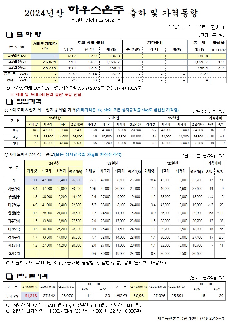 [하우스온주]2024년산 출하 및 가격동향(6/01)
