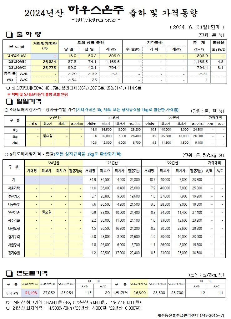 [하우스온주]2024년산 출하 및 가격동향(6/02)