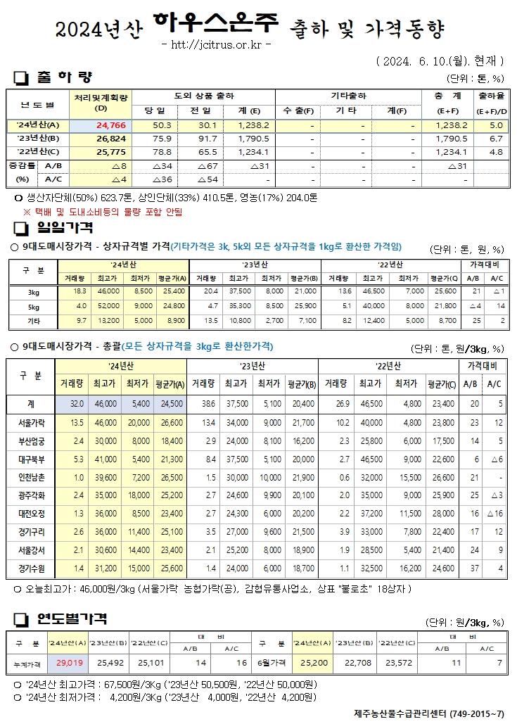 [하우스온주]2024년산 출하 및 가격동향(6/10)