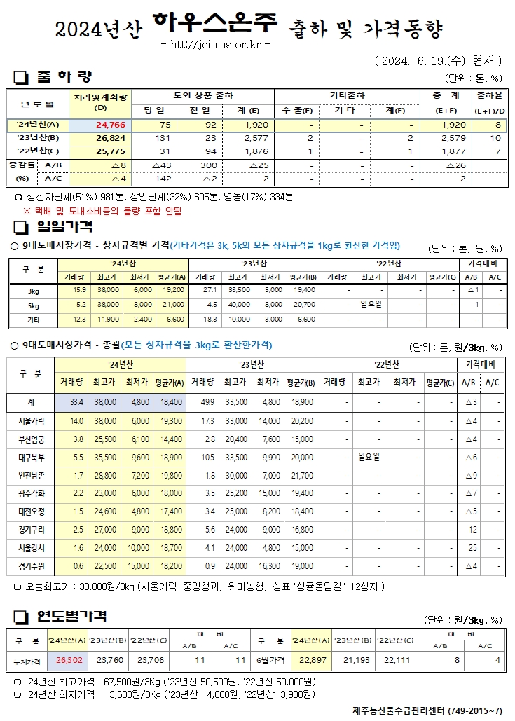 [하우스온주]2024년산 출하 및 가격동향(6/19)