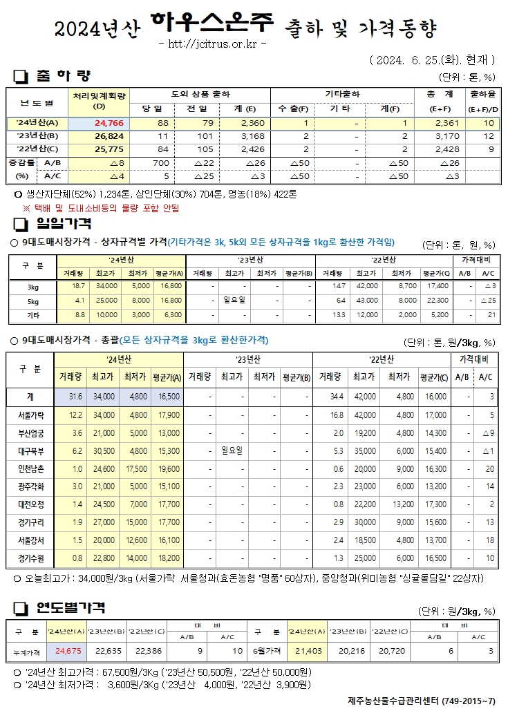 [하우스온주]2024년산 출하 및 가격동향(6/25)