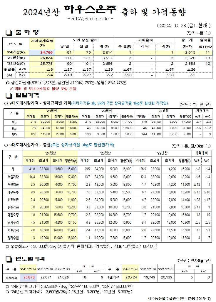 [하우스온주]2024년산 출하 및 가격동향(6/28)