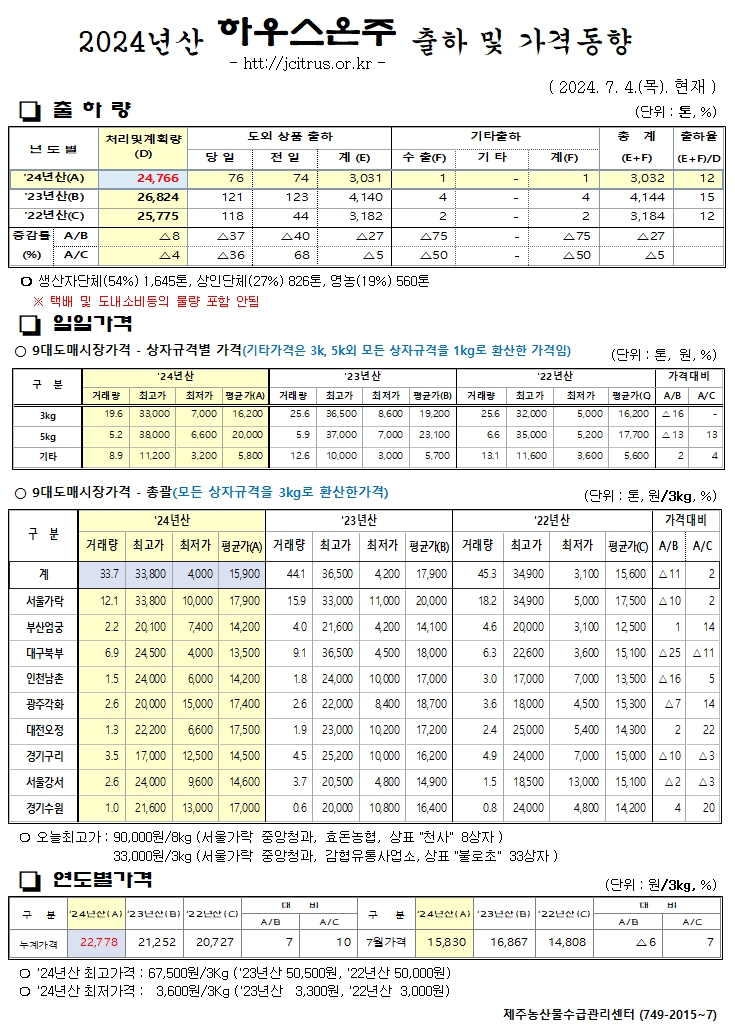 [하우스온주]2024년산 출하 및 가격동향(7/04)