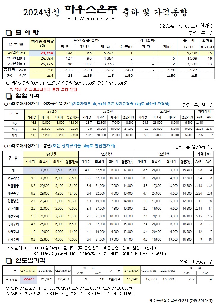 [하우스온주]2024년산 출하 및 가격동향(7/06)