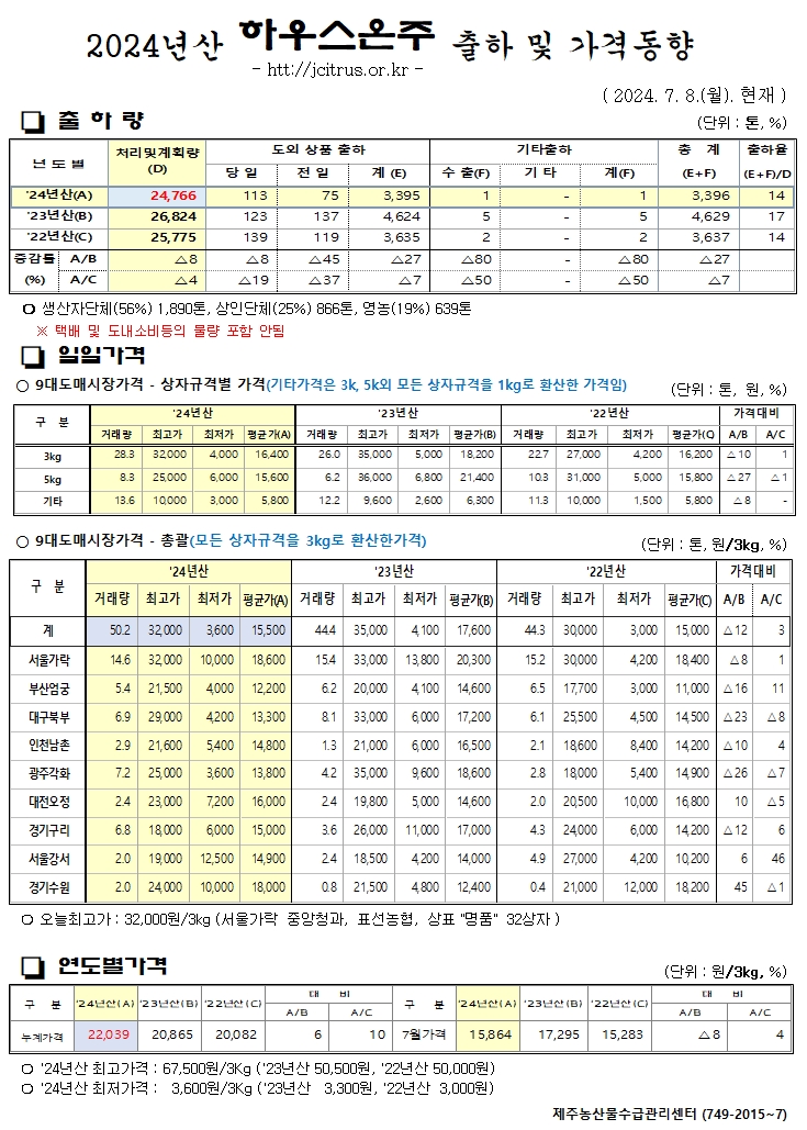 [하우스온주]2024년산 출하 및 가격동향(7/08)