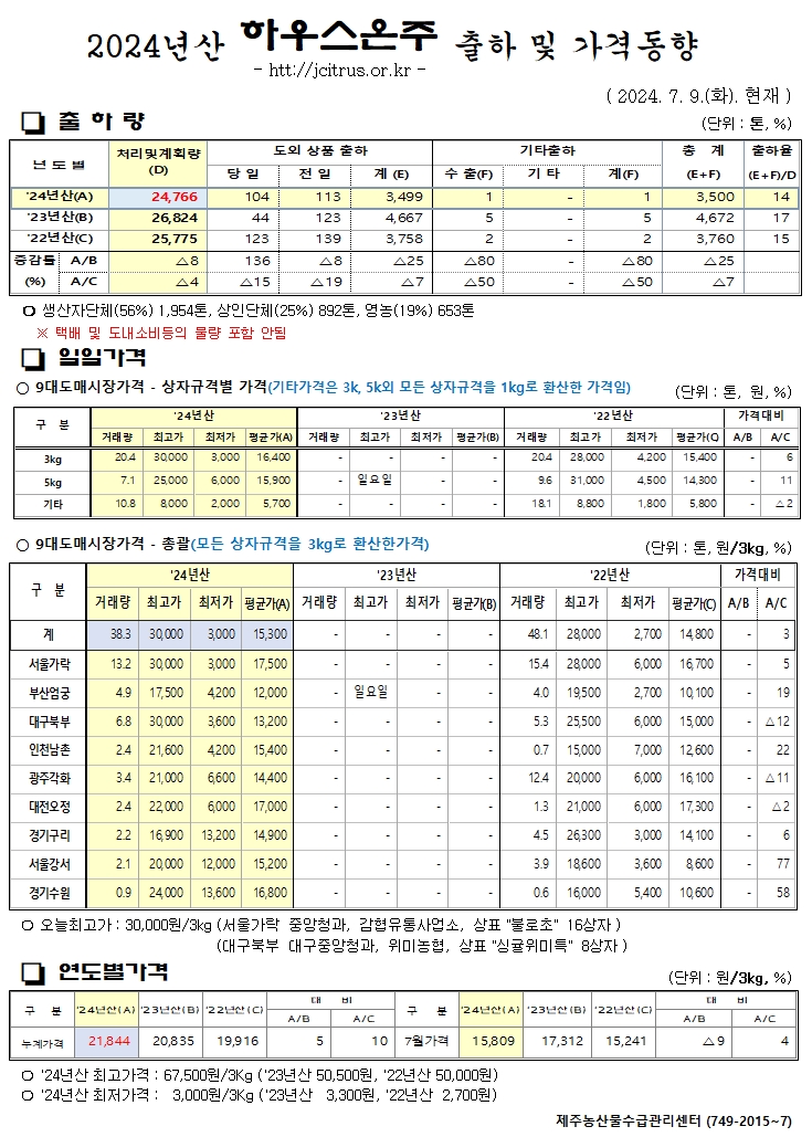 [하우스온주]2024년산 출하 및 가격동향(7/09)