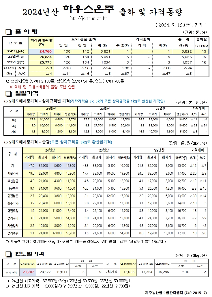 [하우스온주]2024년산 출하 및 가격동향(7/12)