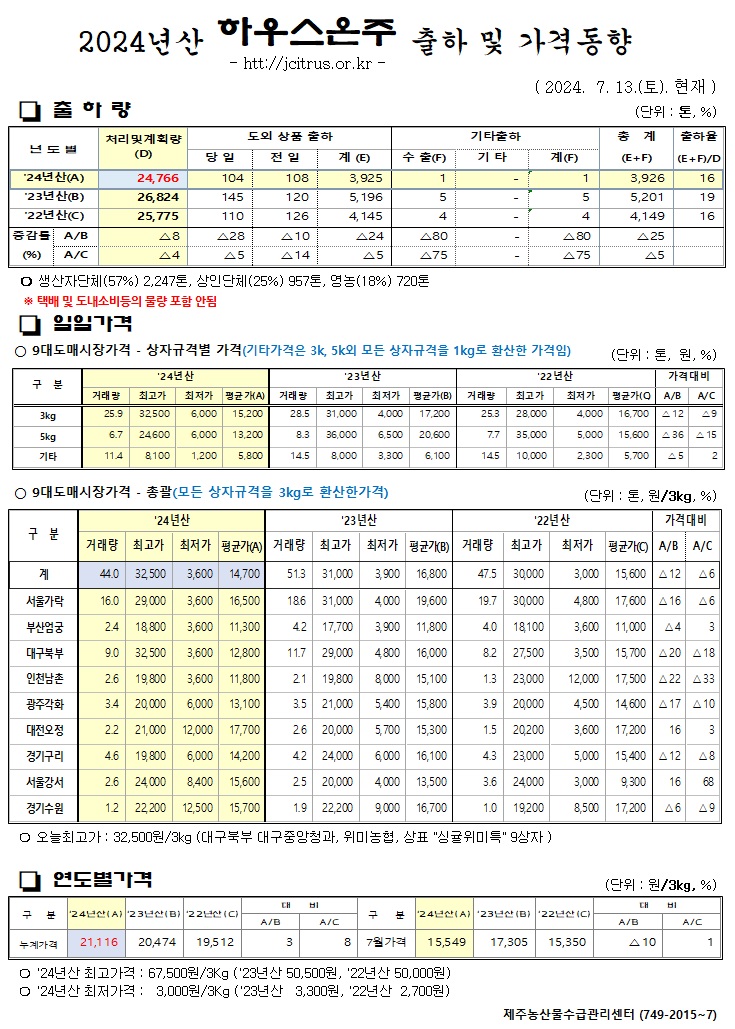 [하우스온주]2024년산 출하 및 가격동향(7/13)