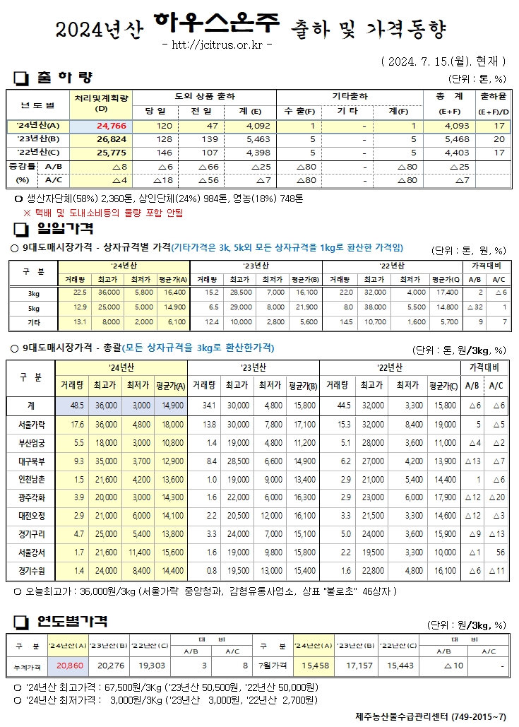 [하우스온주]2024년산 출하 및 가격동향(7/15)