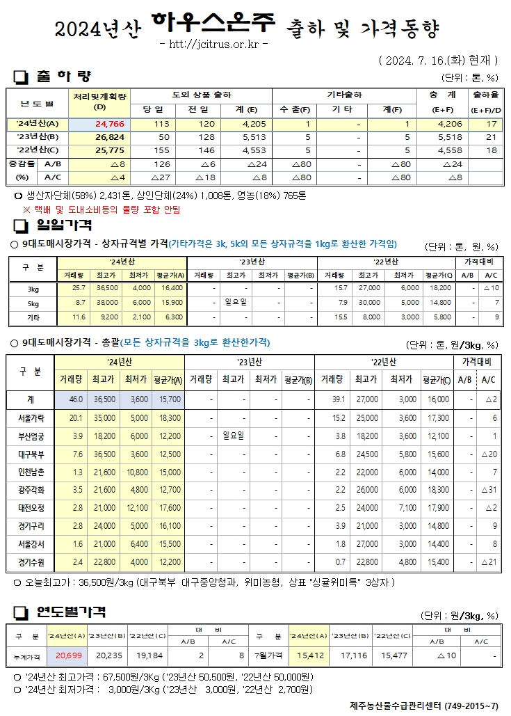 [하우스온주]2024년산 출하 및 가격동향(7/16)