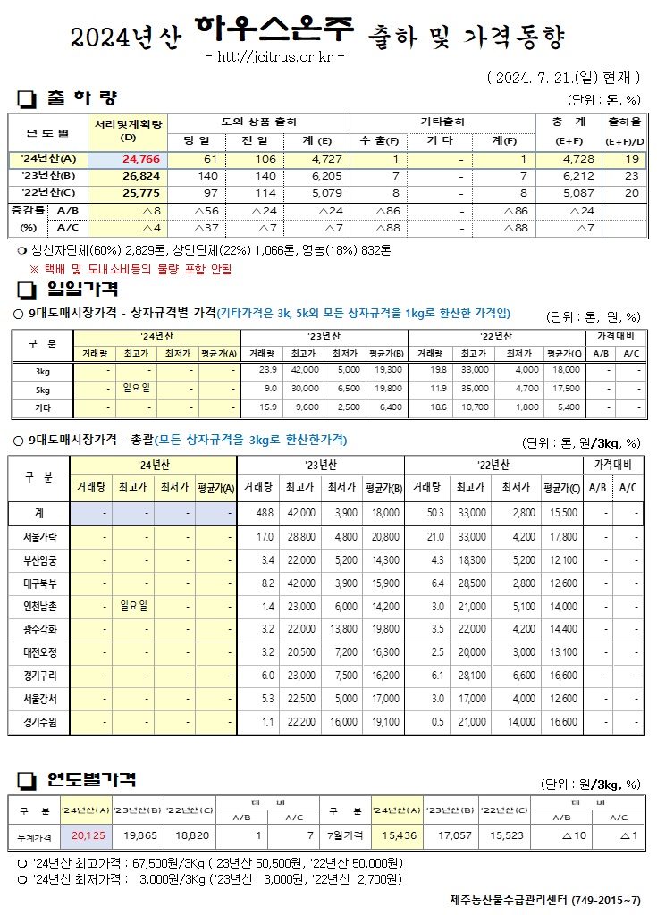 [하우스온주]2024년산 출하 및 가격동향(7/21)