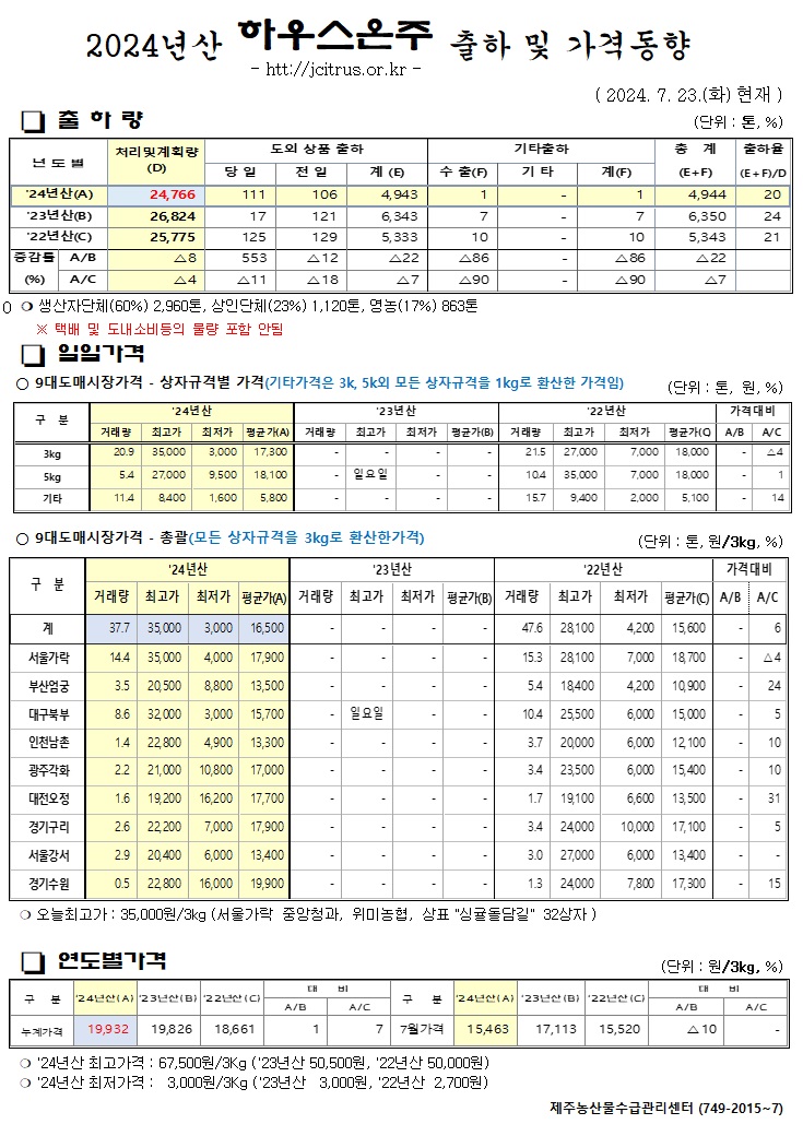 [하우스온주]2024년산 출하 및 가격동향(7/23)