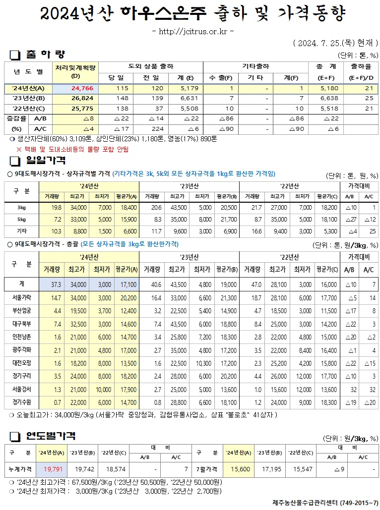 [하우스온주]2024년산 출하 및 가격동향(7/25)