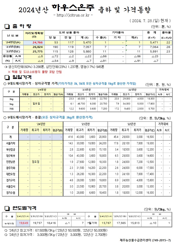 [하우스온주]2024년산 출하 및 가격동향(7/28)