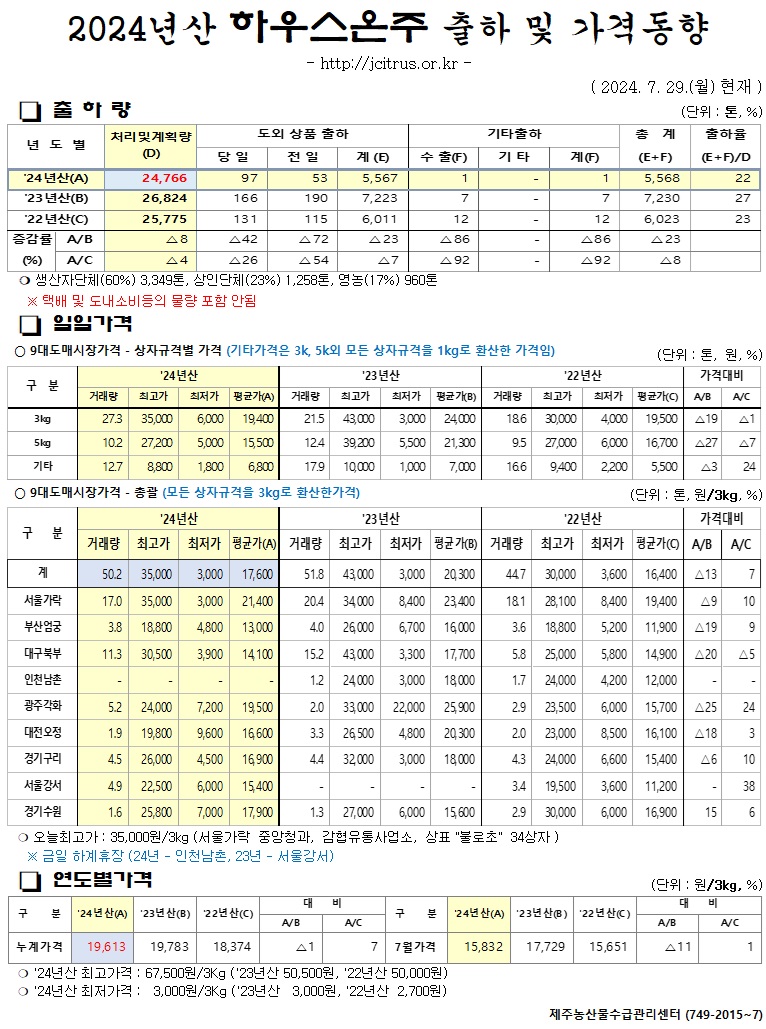 [하우스온주]2024년산 출하 및 가격동향(7/29)