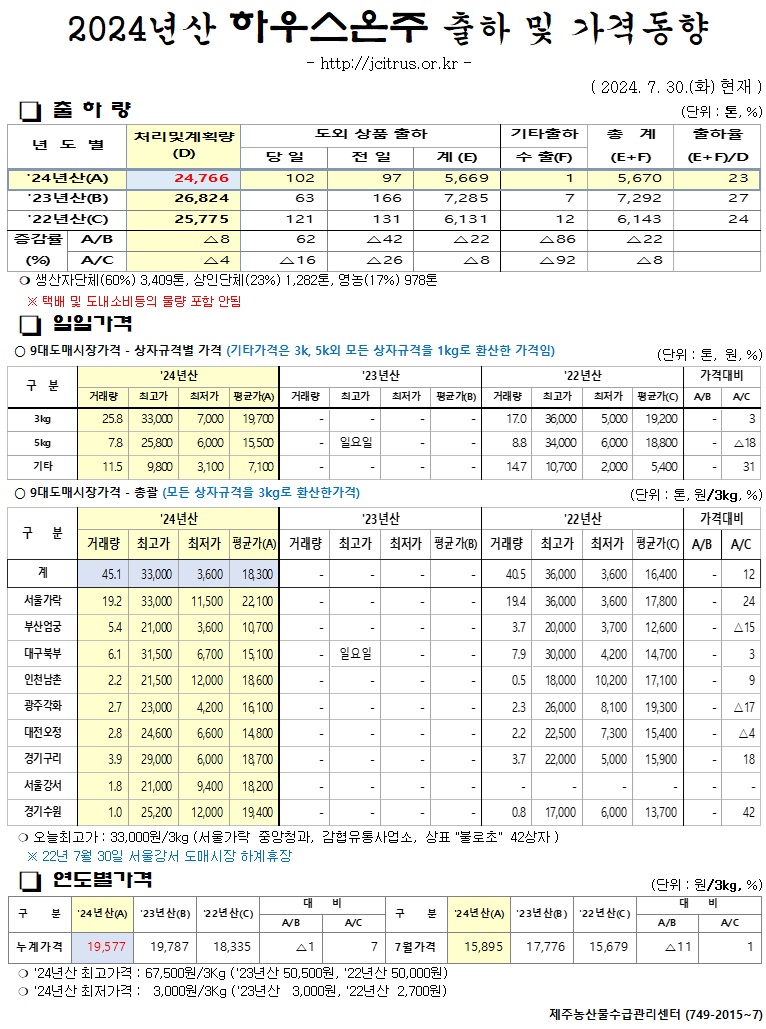 [하우스온주]2024년산 출하 및 가격동향(7/30)