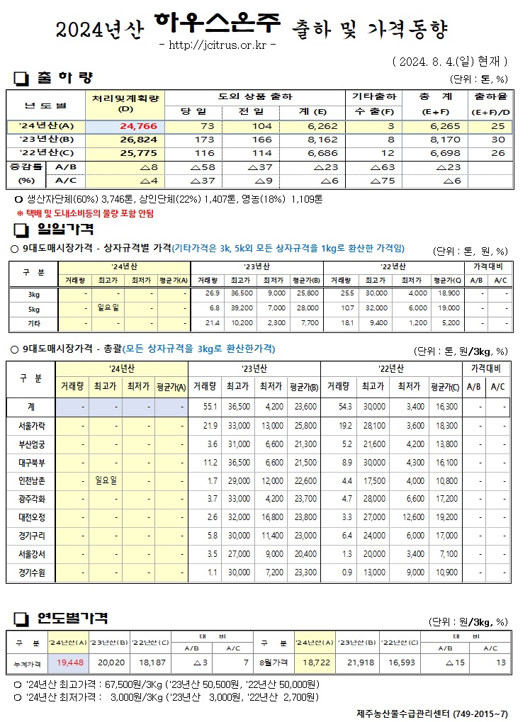 [하우스온주]2024년산 출하 및 가격동향(8/04)